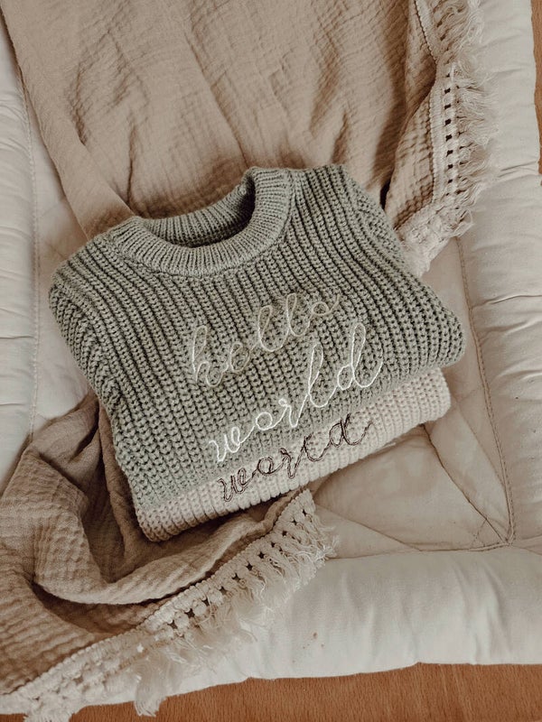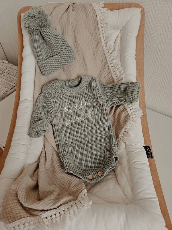 Body nouveau-né en tricot très confortable et doux avec inscription "hello world" brodée, idéal pour la photo de naissance de votre bébé. Sa texture laine (coton) le rend très chaud et confortable.